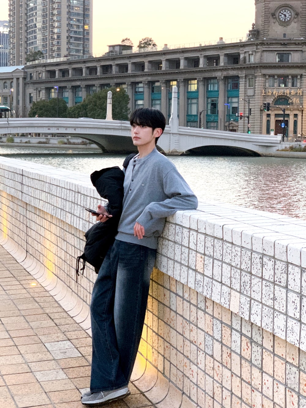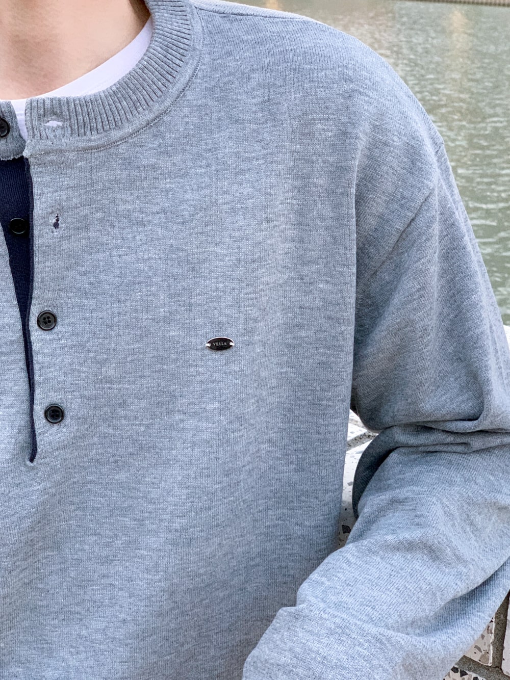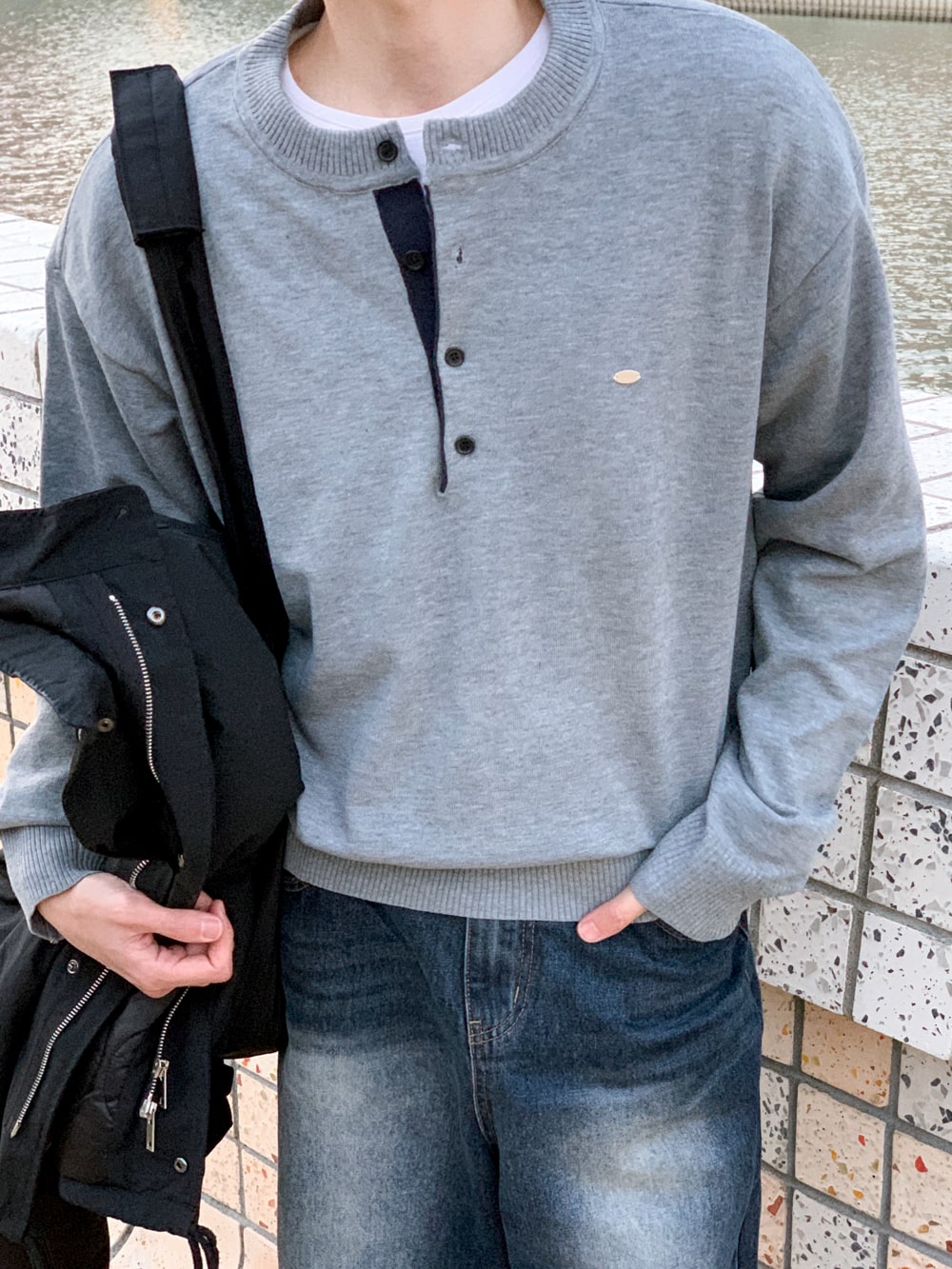 그로스 패치 배색 헨리넥 니트