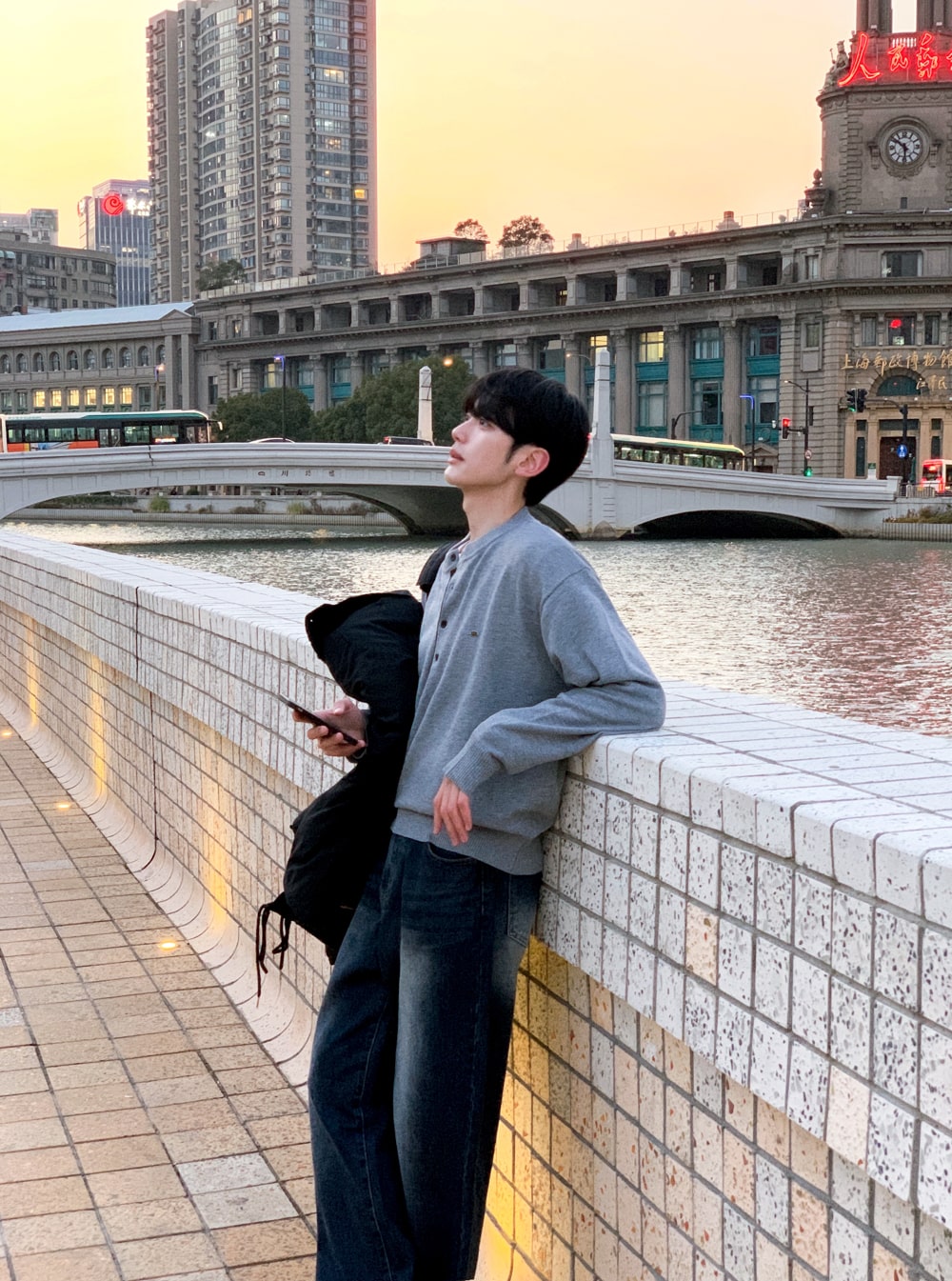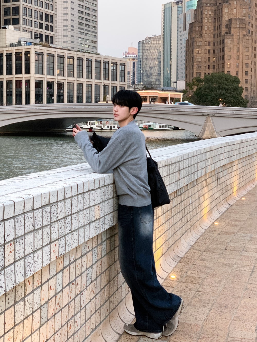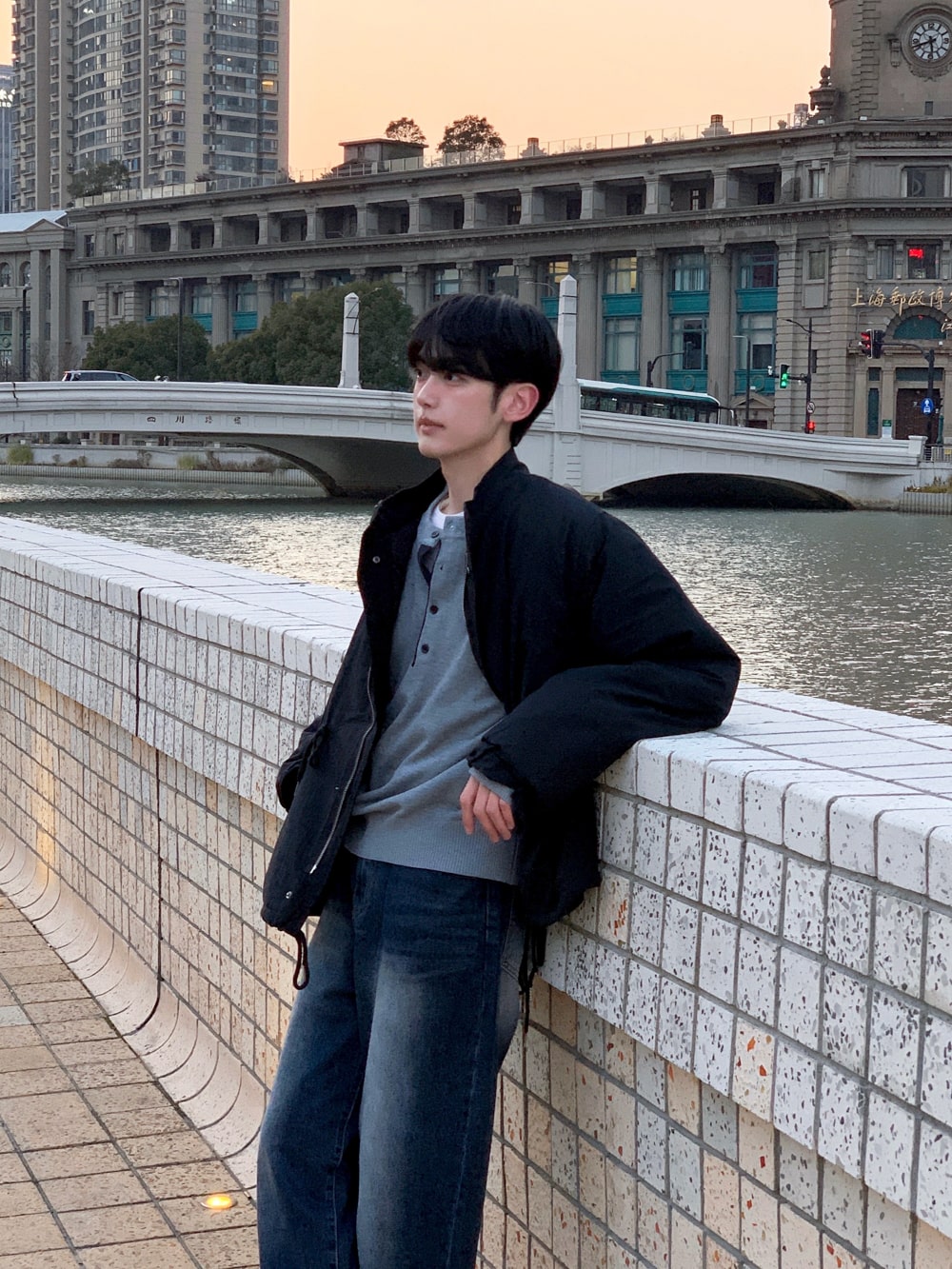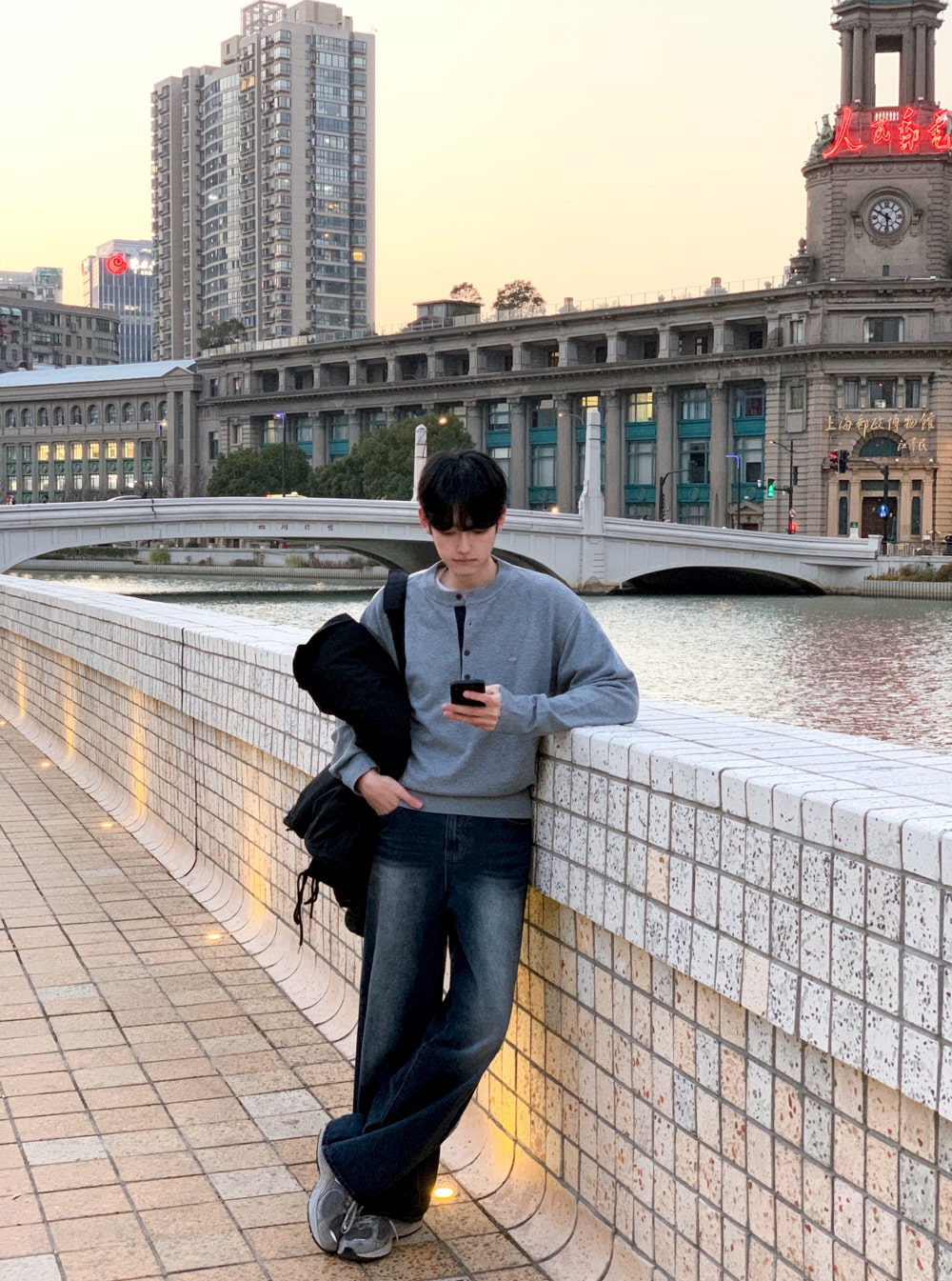 그로스 패치 배색 헨리넥 니트